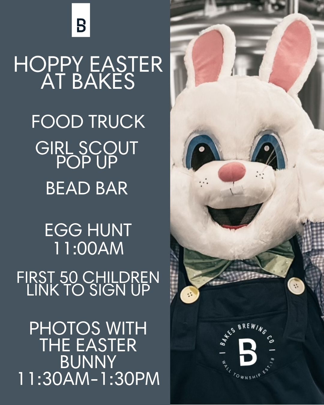 Join us for a springtime afternoon at Bakes Brewing Co! Bring the whole family for a festive day of egg hunting, pictures with the Easter Bunny, delicious food, and more—all with a cold beer in hand. It’s the perfect way to welcome the spring season with friends, food, and fun!